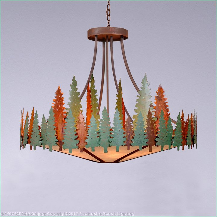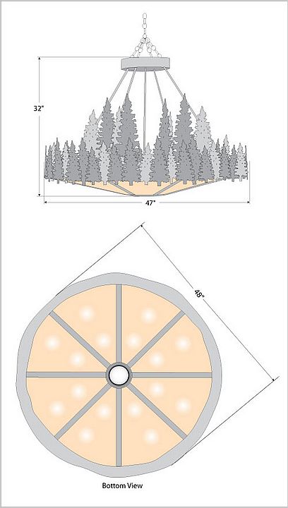 The Crestline Chandelier Extra Large - Pine Tree fixture is 48 inches in diameter and features various sizes of hand-painted trees over our rust patina finish. This chandelier will add warm lighting and rustic character to any log home, cabin or northwood lodge-themed room. The fixture comes with a choice of diffuser material: Almond Mica, Amber Mica, or Ivory Paper. A downlight and matching ceiling canopy are also included, along with 3 feet of chain and 10 feet of extra wire.