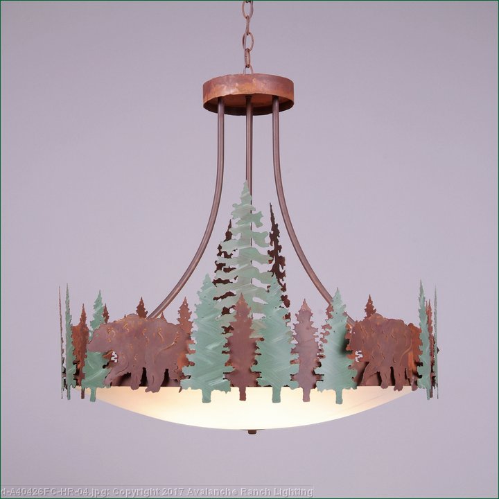 The Crestline Chandelier Medium - Bear fixture is 28 inches in diameter and features images of bears and hand-painted trees over our rust patina finish. This chandelier will add a touch of wildlife and rustic character to any log home, cabin or northwood lodge-themed room. This rustic chandelier comes with the choice of either a frosted glass bowl (FC) or a tea-stained glass bowl (TS). A downlight and matching ceiling canopy are also included, along with 3 feet of chain and 10 feet of extra wire.