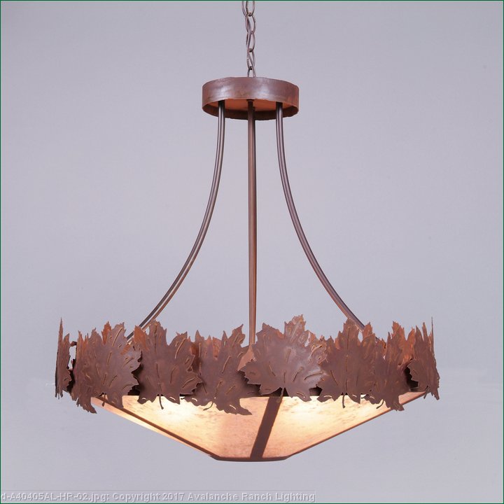 The Crestline Chandelier Medium - Maple fixture is 28 inches in diameter and features a band of metal maple leaves. The leaves are positioned in various directions along the band, and also feature hand-cut interior lines inside each image. This rustic chandelier comes with a choice of diffuser material: Almond Mica, Amber Mica, or Ivory Paper. A downlight and matching ceiling canopy are also included, along with 3 feet of chain and 10 feet of extra wire. This chandelier will add rustic character to any log home, cabin or northwood lodge-themed room.