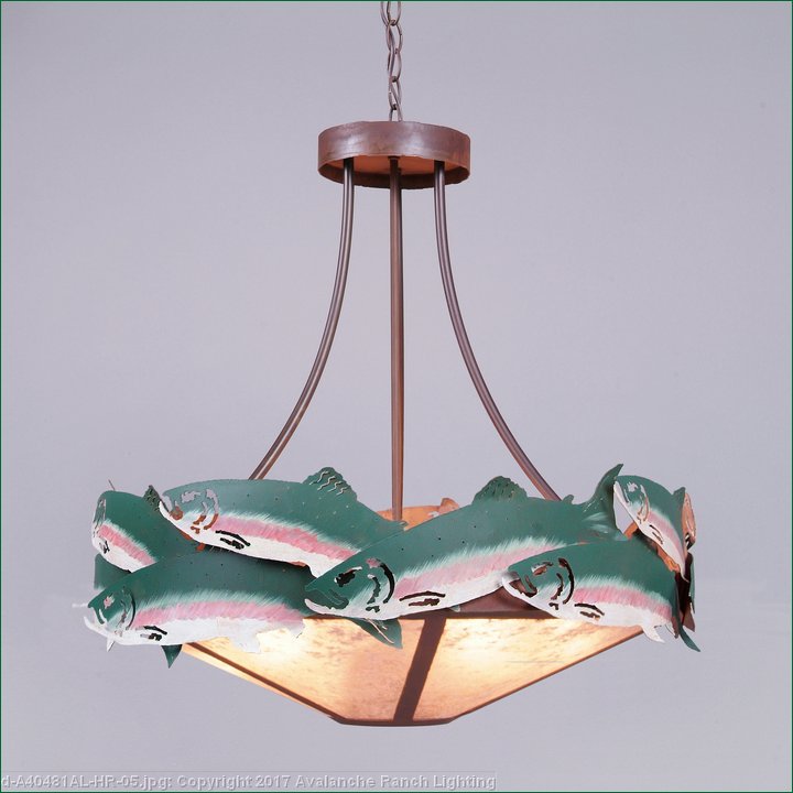 The Crestline Chandelier Medium - Trout fixture is 28 inches in diameter and features our trademarked trout images along the band of the fixture, which are hand-painted using our unique seven-step finishing process. This chandelier will add warm lighting and rustic character to any fisherman's home, log home, cabin, or northwood lodge-themed room. It comes with a choice of diffuser material: Almond Mica, Amber Mica, or Ivory Paper. A downlight and matching ceiling canopy are also included, along with 3 feet of chain and 10 feet of extra wire.