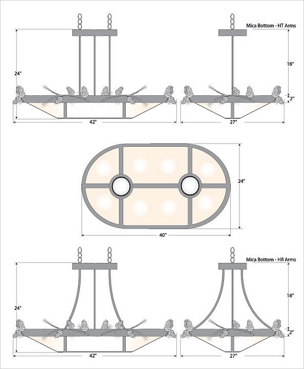 The Crestline Chandelier Oval - Pine Cone fixture is an oval-shaped 24 by 42 inch chandelier that features four sets of pine cone branches positioned around the metal band. Each metal pine cone is handmade, and the branch is textured to look life-like with metal wire pine needles. This rustic chandelier comes with a choice of diffuser material: Almond Mica, Amber Mica, or Ivory Paper. Also included with the fixture are two downlights for direct lighting below, a matching ceiling canopy, 6 feet of chain (for a 3 foot drop), and 10 feet of wire. This item is ideal for anyone looking for a chandelier to add rustic character to their log home, cabin or northwood lodge-themed room.
