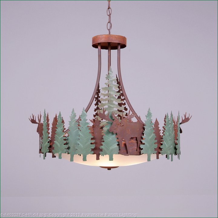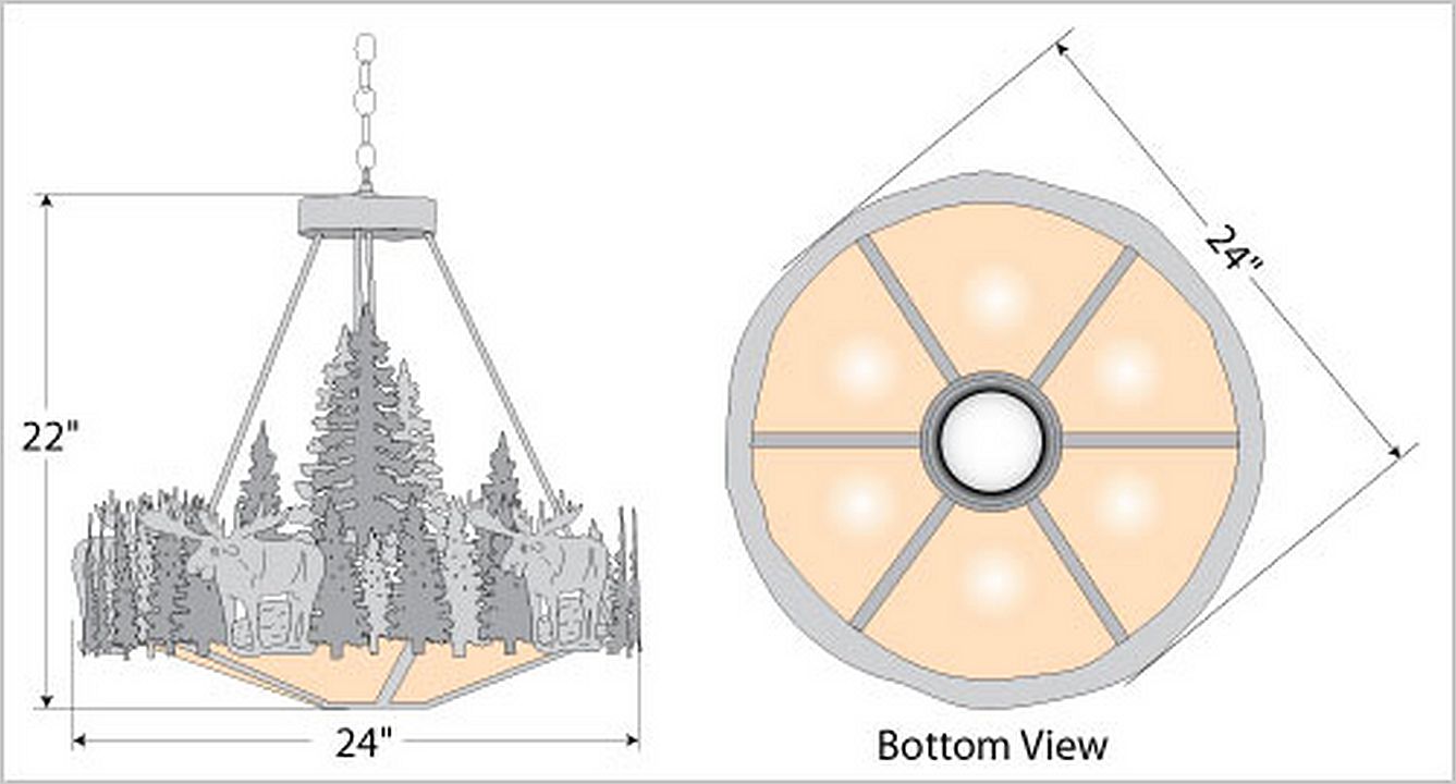 The Crestline Chandelier Small - Moose fixture is 24 inches in diameter and features images of moose and hand-painted trees over our rust patina finish. This chandelier will add a touch of wildlife and rustic character to any log home, cabin or northwood lodge-themed room. This rustic chandelier comes with the choice of either a frosted glass bowl (FC) or a tea-stained glass bowl (TS). A downlight and matching ceiling canopy are also included, along with 3 feet of chain and 10 feet of extra wire.