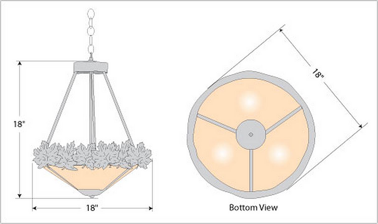 The Crestline Foyer Chandelier Short - Maple Leaf is 18 inches in diameter by 18 inches tall, and features a band of metal maple leaves. The leaves are positioned in various directions along the band, and also feature hand-cut interior lines inside each image. This rustic chandelier comes with a choice of diffuser material: Almond Mica, Amber Mica, or Ivory Paper. A matching ceiling canopy is also included, along with 3 feet of chain and 10 extra feet of wire. This forest-inspired chandelier will add a rustic, northwoods character to the entryway of any log home, cabin or northwood lodge-themed room.