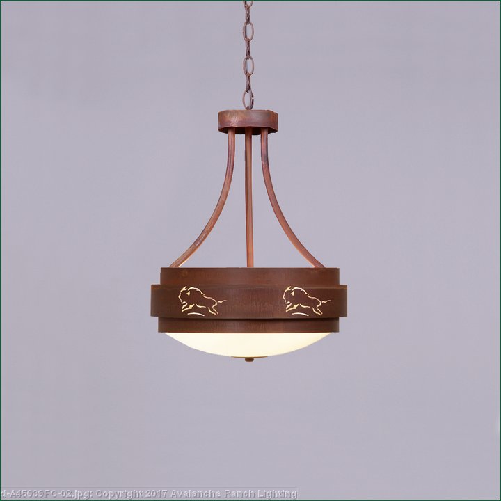 The Northridge Foyer Small - Bison fixture features three steel bands arranged on top of one another, the center band with cutouts of bison images going around the circumference of the fixture. Behind each cutout is synthetic mica and a frost white glass bowl is attached in the center. This Southwest-inspired design is ideal for anyone looking for a small rustic chandelier to add Southwestern character to their log home, cabin or northwood lodge-themed room. A matching ceiling canopy, 3 feet of chain and 10 extra feet of wire are also included.