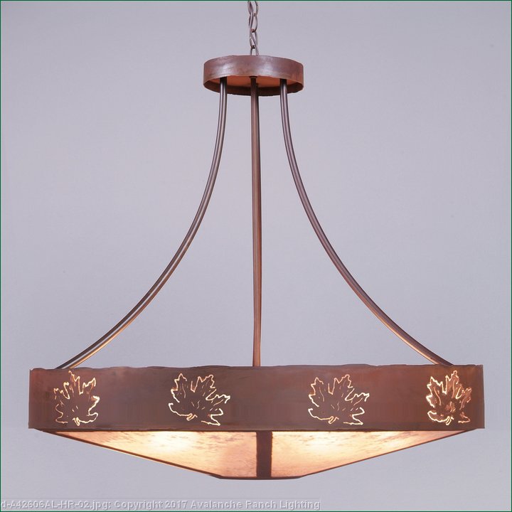 The Ridgemont Chandelier Extra Large - Maple Cutout is 47 inches in diameter, and features our exclusive maple leaf cutouts around the steel band. Behind each cutout is a diffuser panel. This rustic chandelier comes with a choice of diffuser material: Almond Mica, Amber Mica or Ivory Paper. For the styles with a diffuser bottom, a single downlight is built into the bowl. A matching ceiling canopy is also included, along with 3 feet of chain and 10 extra feet of wire. This forest-inspired design will add a rustic, woodland character to any log home, cabin or northwood lodge-themed room.