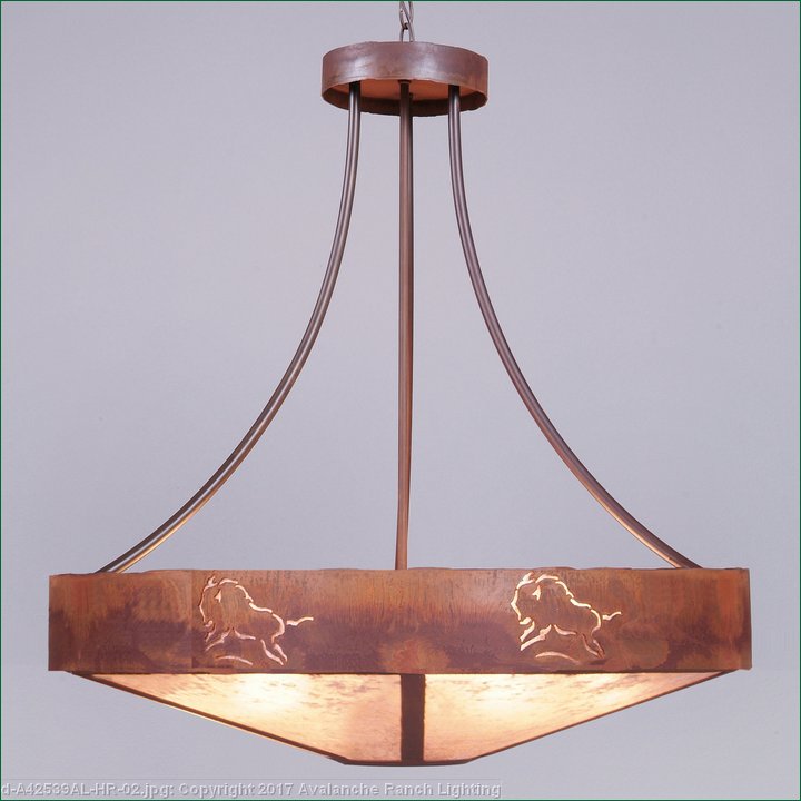 The Ridgemont Chandelier Large - Bison is 35 inches in diameter and features our exclusive southwestern bison cutout around the steel band. Behind each cutout is a diffuser panel. This rustic chandelier comes with a choice of diffuser material: Almond Mica, Amber Mica or Ivory Paper. For the styles with a diffuser bottom, a single downlight is built into the bowl. A matching ceiling canopy is also included, along with 3 feet of chain and 10 extra feet of wire. This item will add a rustic, Southwestern character to any log home, cabin or northwood lodge-themed room.