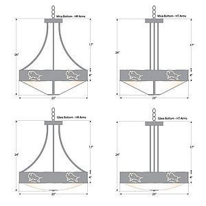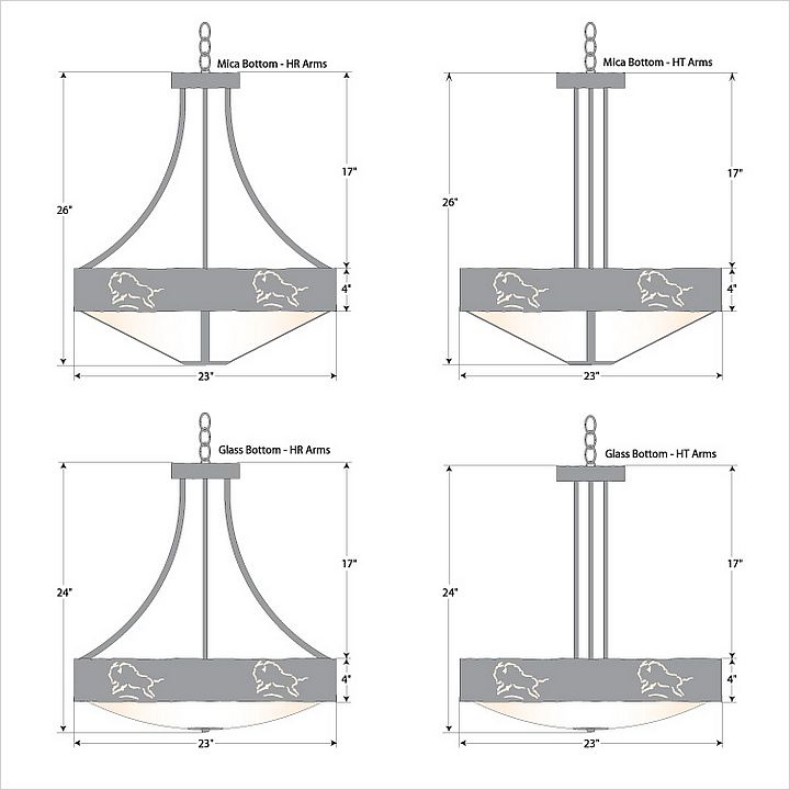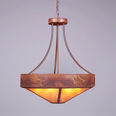 The Ridgemont Chandelier Small - Bison is 24 inches in diameter and features our exclusive southwestern bison cutout around the steel band. Behind each cutout is a diffuser panel. This rustic chandelier comes with a choice of diffuser material: Almond Mica, Amber Mica or Ivory Paper. For the styles with a diffuser bottom, a single downlight is built into the bowl. A matching ceiling canopy is also included, along with 3 feet of chain and 10 extra feet of wire. This item will add a rustic, Southwestern character to any log home, cabin or northwood lodge-themed room.