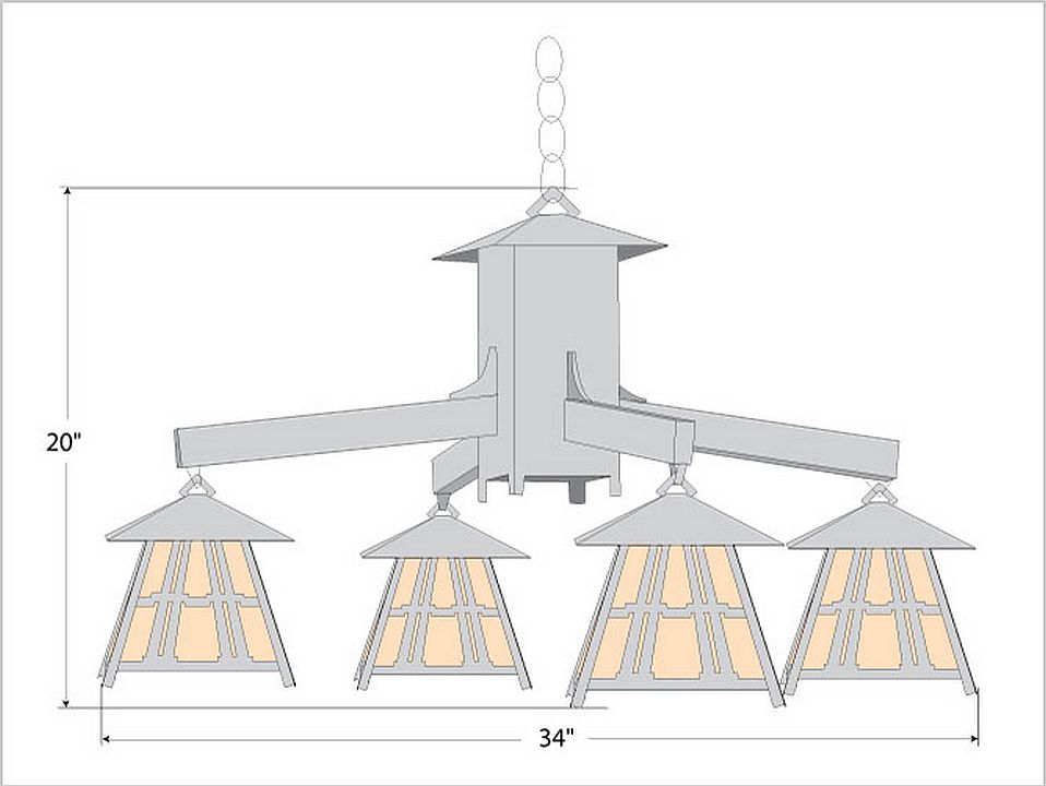 The Smoky Mtn 4 Light Chandelier - Eastlake features our Smoky Mtn small lanterns hanging at a slight downward angle from four steel arms. The front and side panels all feature our exclusive mission-style artwork. The lanterns also come with a diffuser material choice between Almond or Amber mica. A square ceiling canopy is included, along with 3 feet of chain and 10 extra feet of wire. This Mission-style chandelier will bring warm lighting and character to any cottage, home, or craftsman-styled room.