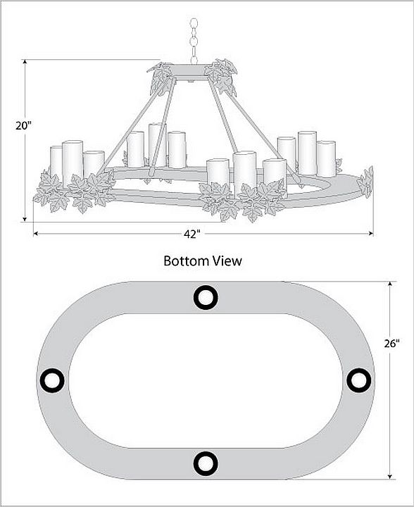 The Wisley Oval Chandelier - Maple features a one- inch thick round band holding 12 candelabra bulbs with eight, 5 inch tall cylinder glass and four, 6 inch tall pieces for covering them. Choice of glass between frost clear or tea stain. Optionally for underneath, there are four type G4 20W halogen bulbs on a separate switch for lighting the area under the light. Hand-cut steel maple leaves are attached along the band in front of each of the bulb sets and on the upper canopy. This chandelier is ideal for anyone looking to add stylish rustic contemporary ceiling lighting to their log home, cabin or northwood lodge-themed room. A matching ceiling canopy, 3 ft of chain and 10 extra feet of wire are also included.
