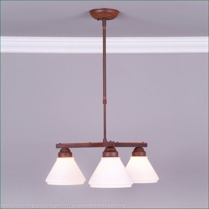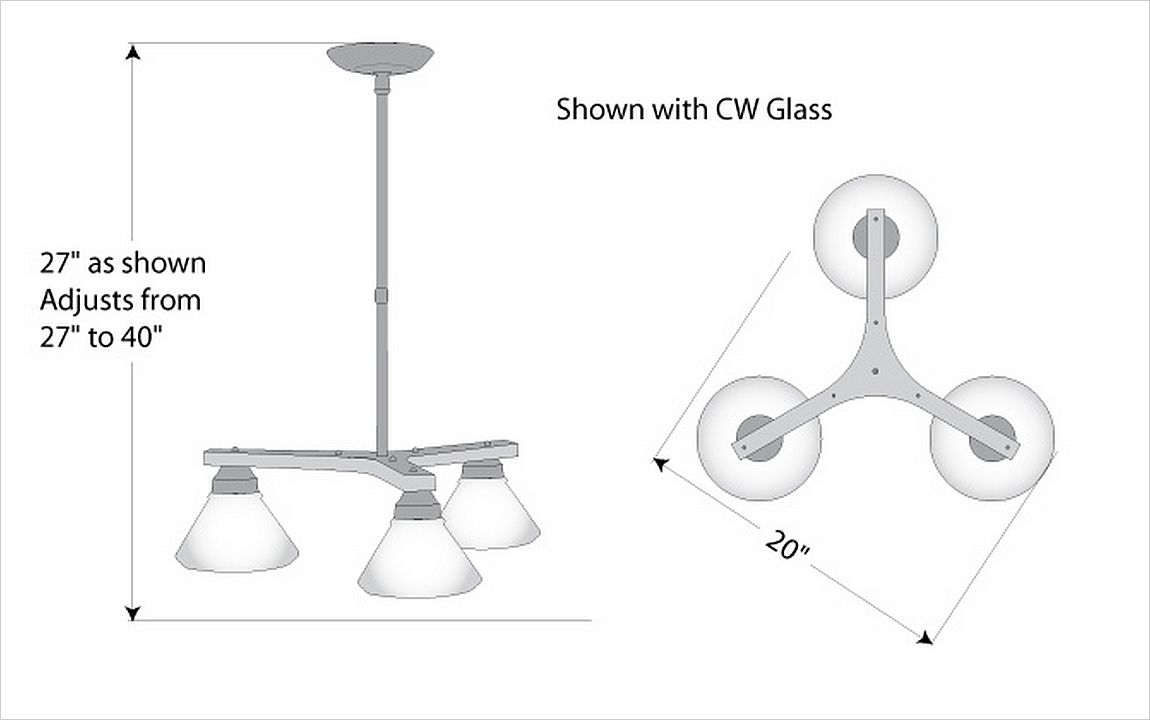 The Cedarwood 3 Light Chandelier - Rustic Plain features three bulbs, adjustable height stem and a choice of two different styles of cone glass. Included with the fixture is 10 feet of wire and a telescoping stem that has a 12 inch adjustment range from 15 to 27 inches. For longer adjustments up to 138 inches, order one or more of the extension kits. A matching 5 by 6 inch ceiling canopy is also included. To add extensions to stem length, use accessory kits for single stem fixtures PK210.