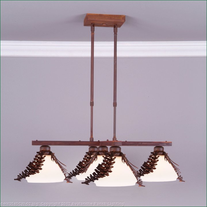 The Cedarwood 5 Light Chandelier - Spruce Cone features five bulbs, adjustable height stems and a choice of two different styles of cone glass. Surrounding each piece of glass is our exclusive three dimensional spruce cone artwork. Included with the fixture is 10 feet of wire and two telescoping stems that have a 12 inch adjustment range from 15 to 27 inches. For longer adjustments up to 138 inches, order one or more of the extension kits. A matching 5 by 6 inch ceiling canopy is also included. To add extensions to stem length, use accessory kits for double stem fixtures PK460. For vaulted ceilings, use accessory Kit CK422