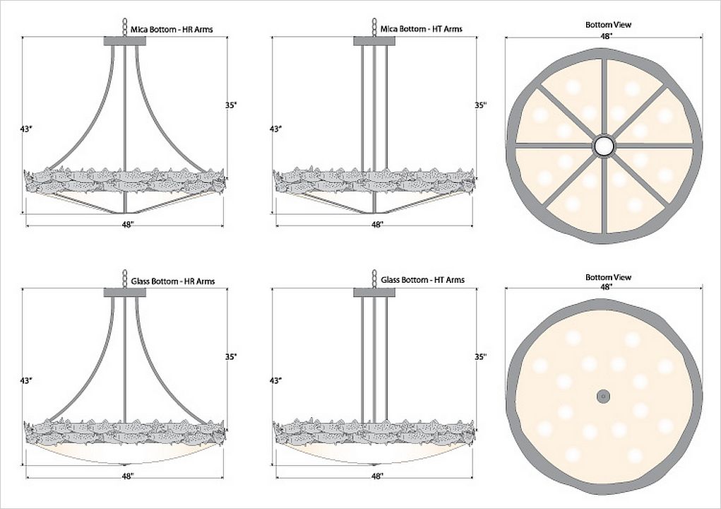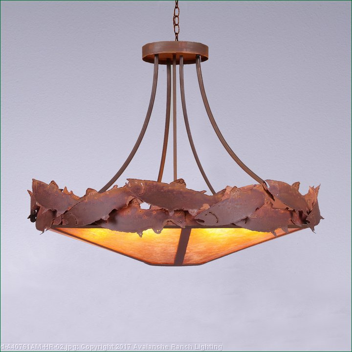 The Crestline Chandelier Extra Large - Salmon fixture is 48 inches in diameter and features images of salmon along the band of the fixture. This chandelier will add a touch of wildlife and rustic character to any log home, cabin or northwood lodge-themed room. The fixture comes with a choice of diffuser material: Almond Mica, Amber Mica, or Ivory Paper. A downlight and matching ceiling canopy are also included, along with 3 feet of chain and 10 feet of extra wire.