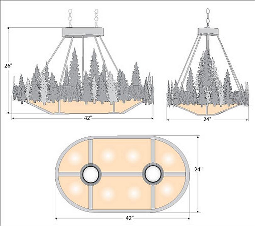 The Crestline Chandelier Oval - Bear fixture is an oval-shaped 24 by 42 inch chandelier. This item features images of bears and hand-painted trees over a rust patina-finished band. This chandelier will add a touch of wildlife and rustic character to any log home, cabin, or northwood lodge-themed room. This item comes with a choice of diffuser material: Almond Mica, Amber Mica, or Ivory Paper. The fixture also features our Curved Side Pipes (HR), and has two downlights for direct lighting below. Included with the fixture is a matching ceiling canopy, 6 feet of chain (for a 3 foot drop), and 10 feet of wire.
