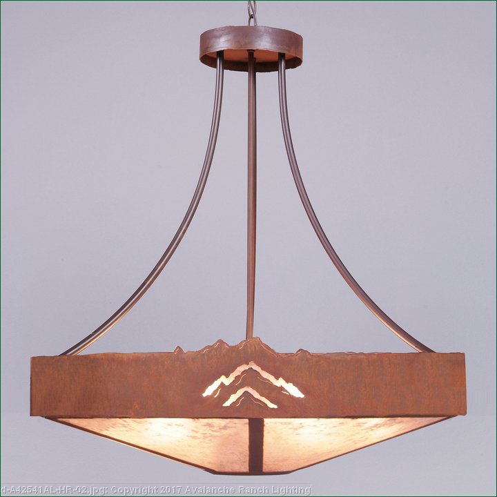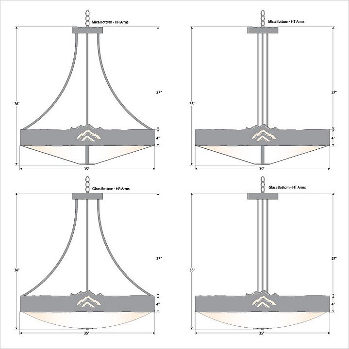 The Ridgemont Chandelier Large - Mountain is 35 inches in diameter and features our exclusive mountain cutout around the steel band. Behind each cutout is a diffuser panel. This rustic chandelier comes with a choice of diffuser material: Almond Mica, Amber Mica or Ivory Paper. For the styles with a diffuser bottom, a single downlight is built into the bowl. A matching ceiling canopy is also included, along with 3 feet of chain and 10 extra feet of wire. This forest-inspired design will add a rustic, woodland character to any log home, cabin or northwood lodge-themed room.