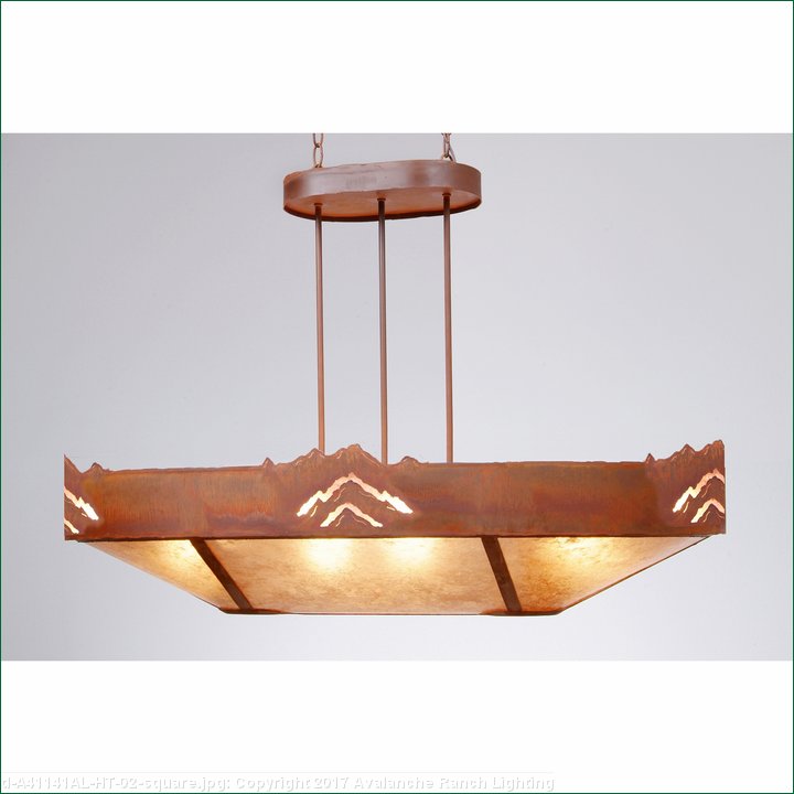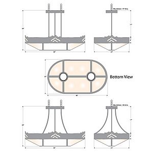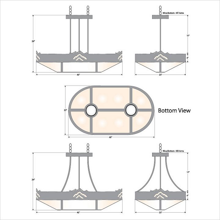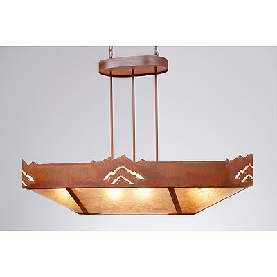 The Ridgemont Chandelier Oval - Mountain fixture is oval shaped 24 by 42 inches and features mountain patterns cutout around the band of the chandelier. This Southwest-inspired design is ideal for anyone looking for a rustic chandelier to add Southwestern character to their log home, cabin or northwood lodge-themed room. It comes with a choice of diffuser material: Almond Mica, Amber Mica, or Ivory Paper. There are also two downlights for direct lighting to a table. A matching ceiling canopy, along with 6 feet of chain (for a 3 foot drop) and 10 extra feet of wire are also included.