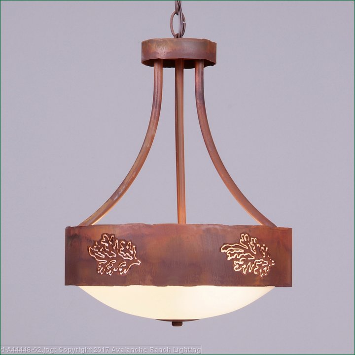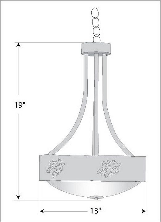 The Ridgemont Foyer Chandelier Medium - Cedar Bough Cutout is 13 inch in diameter and and features our exclusive cedar bough art cutouts around the circumference of the fixture. Behind each cutout is a diffuser panel. Offered with the curved arms and frost white glass bowl only. A matching ceiling canopy, 3 feet of chain and 10 extra feet of wire are also included. The sleek design of this light, along with the warm atmosphere created by its lighting, will add stylish rustic contemporary character to any home.