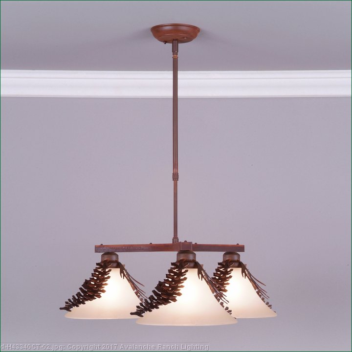 The Cedarwood 3 Light Chandelier - Spruce Cone features three bulbs, adjustable height stem and a choice of two different styles of cone glass. Surrounding each piece of glass is our exclusive three dimensional spruce cone artwork. Included with the fixture is 10 feet of wire and a telescoping stem that has a 12 inch adjustment range from 15 to 27 inches. For longer adjustments up to 138 inches, order one or more of the extension kits. A matching 5 by 6 inch ceiling canopy is also included. To add extensions to stem length, use accessory kits for single stem fixtures PK210.