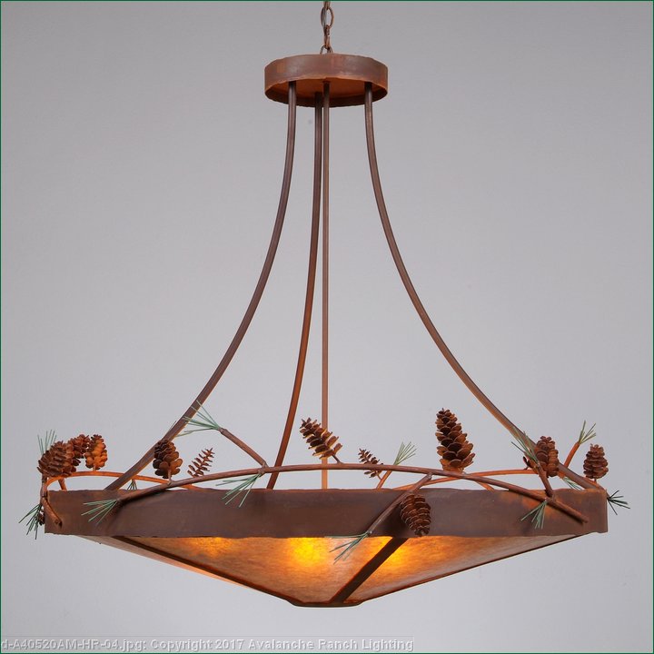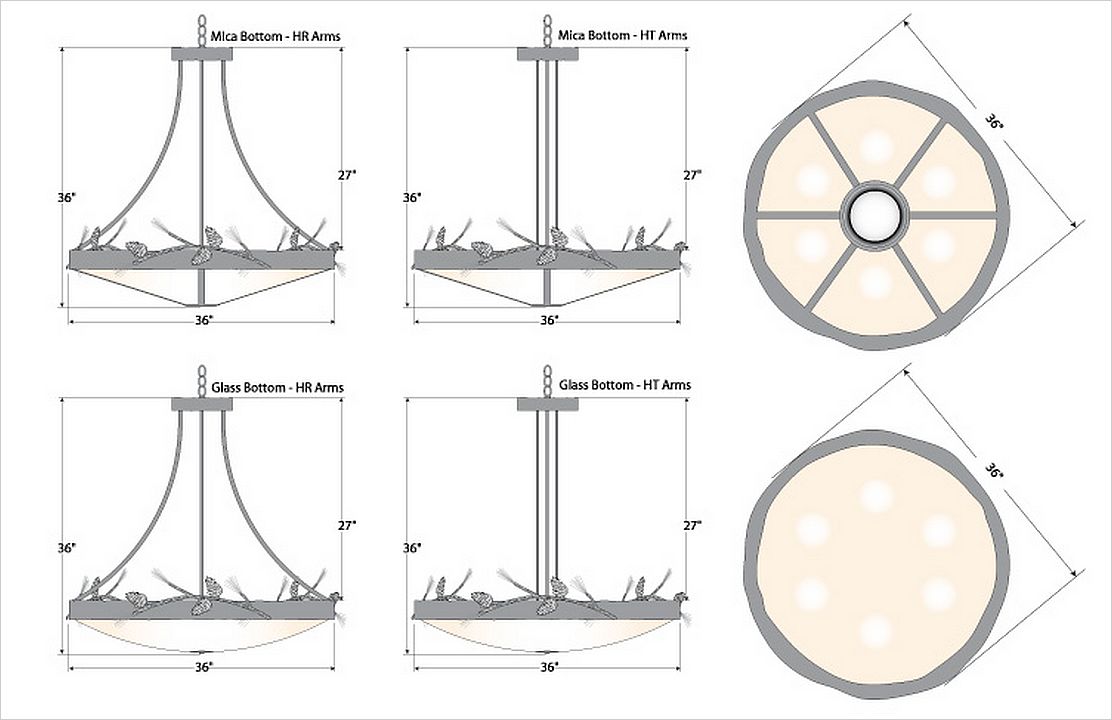 The Crestline Chandelier Small - Pine Cone fixture is 36 inches in diameter and features three sets of pine cone branches positioned around a metal band. Each metal pine cone is handmade, and the branch is textured to look life-like with metal wire pine needles. This rustic chandelier comes with a choice of diffuser material: Almond Mica, Amber Mica, or Ivory Paper. The fixture features our standard Curved Side Pipes (HR), but for an extra charge, we also make the Pine Branch Arms with pines cones and needles (HP). A downlight and matching ceiling canopy are also included, along with 3 feet of chain and 10 feet of extra wire. This chandelier will add rustic character to any log home, cabin or northwood lodge-themed room.
