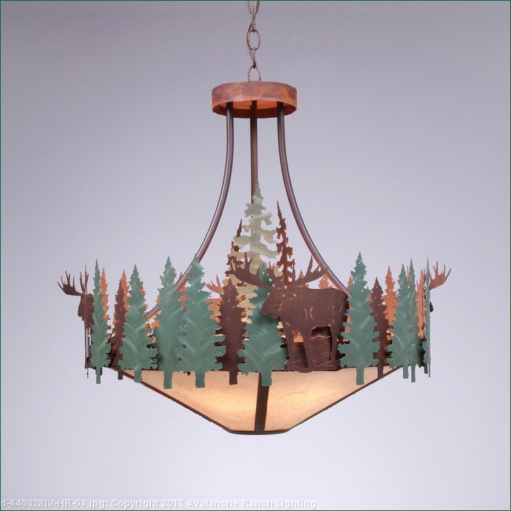 The Crestline Chandelier Small - Moose fixture is 24 inches in diameter and features images of moose and hand-painted trees over our rust patina finish. This chandelier will add a touch of wildlife and rustic character to any log home, cabin or northwood lodge-themed room. The fixture comes with a choice of diffuser material: Almond Mica, Amber Mica, or Ivory Paper. A downlight and matching ceiling canopy are also included, along with 3 feet of chain and 10 feet of extra wire.