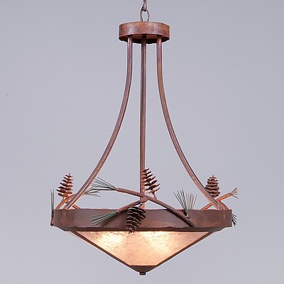 The Crestline Foyer Chandelier Tall - Pine Cone is 18 inches in diameter by 26 inches tall, and features three sets of pine cone branches positioned around a metal band. Each metal pine cone is handmade, and the branch is textured to look life-like with metal wire pine needles. This rustic chandelier comes with a choice of diffuser material: Almond Mica, Amber Mica, or Ivory Paper. The fixture features our standard Curved Side Pipes (HR), but for an extra charge, we also make the Pine Branch Arms with pines cones and needles (HP). A matching ceiling canopy is also included, along with 3 feet of chain and 10 extra feet of wire. This forest-inspired chandelier will add a rustic, northwoods character to the entryway of any log home, cabin or northwood lodge-themed room.