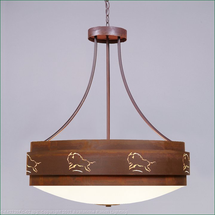 The Northridge Chandelier Large - Bison fixture features three steel bands arranged on top of one another, the center band with hand-cut bison images going around the circumference of the fixture. Behind each cutout is thin acrylic panels and a frost white glass bowl is attached in the center. This Southwest-inspired design is ideal for anyone looking for a rustic chandelier to add Southwestern character to their log home, cabin or northwood lodge-themed room. A matching ceiling canopy, 3 feet of chain and 10 extra feet of wire are also included.
