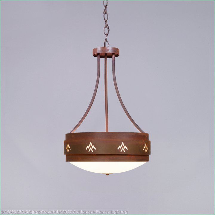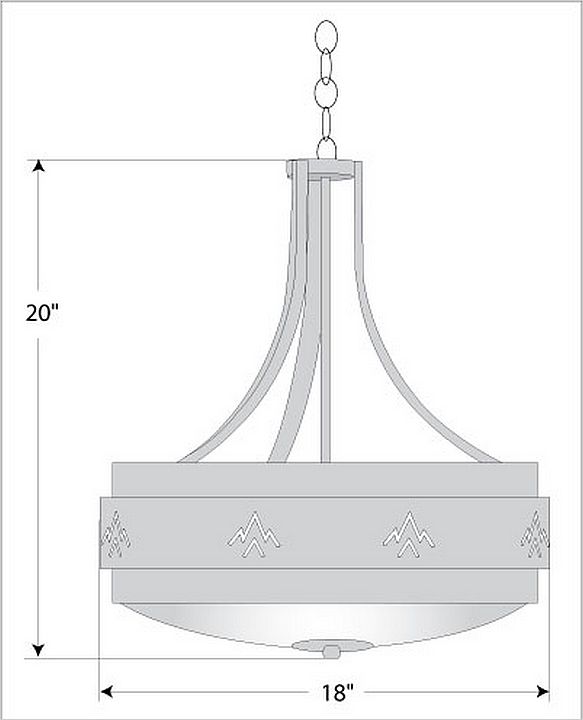 The Northridge Foyer Large - Deception Pass fixture features three steel bands arranged on top of one another, the center band with cutouts of mountain images going around the circumference of the fixture. Behind each cutout is thin acrylic panels and a frost white glass bowl is attached in the center. This Southwest-inspired design is ideal for anyone looking for a small rustic chandelier to add Southwestern character to their log home, cabin or northwood lodge-themed room. A matching ceiling canopy, 3 feet of chain and 10 extra feet of wire are also included.