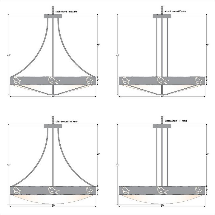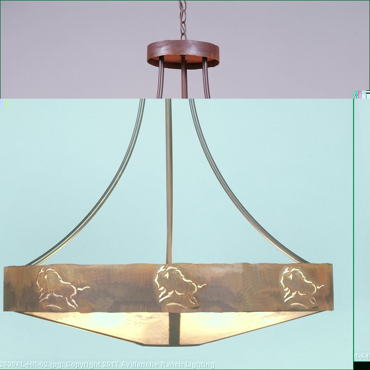 The Ridgemont Chandelier Extra Large - Bison is 47 inches in diameter and features our exclusive southwestern bison cutout around the steel band. Behind each cutout is a diffuser panel. This rustic chandelier comes with a choice of diffuser material: Almond Mica, Amber Mica or Ivory Paper. For the styles with a diffuser bottom, a single downlight is built into the bowl. A matching ceiling canopy is also included, along with 3 feet of chain and 10 extra feet of wire. This item will add a rustic, Southwestern character to any log home, cabin or northwood lodge-themed room.