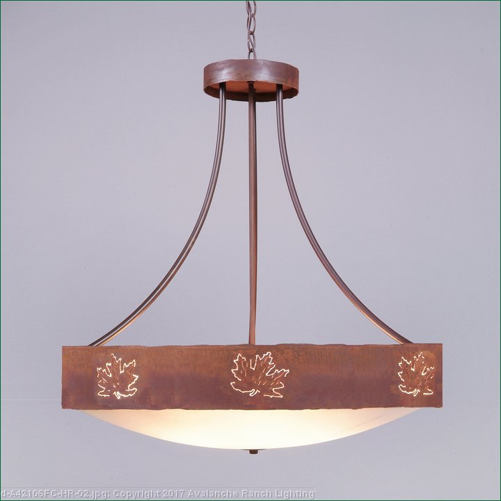 The Ridgemont Chandelier Medium - Maple Cutout is 27 inches in diameter, and features our exclusive maple leaf cutouts around the steel band. Behind each cutout is a diffuser panel. This rustic chandelier comes with the choice of either a frosted glass bowl (FC) or a tea-stained glass bowl (TS). A matching ceiling canopy is also included, along with 3 feet of chain and 10 extra feet of wire. This forest-inspired design will add a rustic, woodland character to any log home, cabin or northwood lodge-themed room.