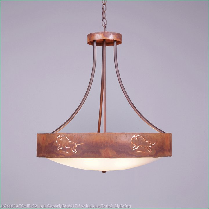 The Ridgemont Chandelier Small - Bison is 24 inches in diameter and features our exclusive southwestern bison cutout around the steel band. Behind each cutout is a diffuser panel. This rustic chandelier comes with the choice of either a frosted glass bowl (FC) or a tea-stained glass bowl (TS). A matching ceiling canopy is also included, along with 3 feet of chain and 10 extra feet of wire. This item will add a rustic, Southwestern character to any log home, cabin or northwood lodge-themed room.
