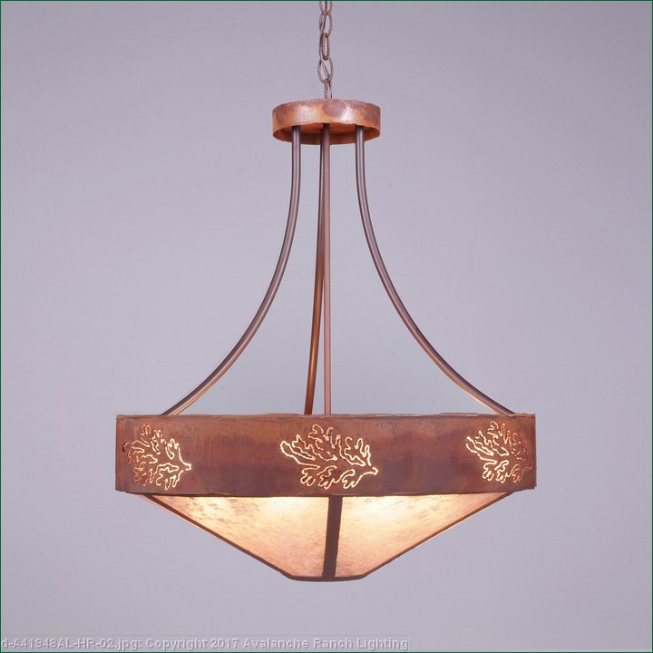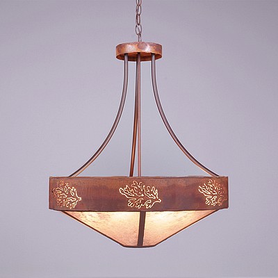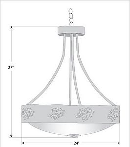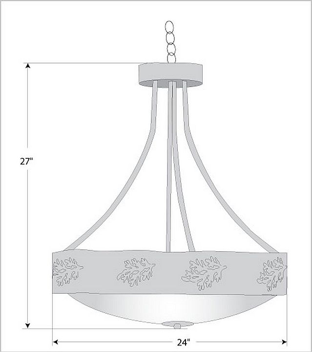 The Ridgemont Chandelier Small - Cedar Bough Cutout is 24 inches in diameter and features our exclusive cedar bough cutout around the steel band. Behind each cutout is a diffuser panel. This rustic chandelier comes with a choice of diffuser material: Almond Mica, Amber Mica or Ivory Paper. For the styles with a diffuser bottom, a single downlight is built into the bowl. A matching ceiling canopy is also included, along with 3 feet of chain and 10 extra feet of wire. This forest-inspired design will add a rustic, woodland character to any log home, cabin or northwood lodge-themed room.