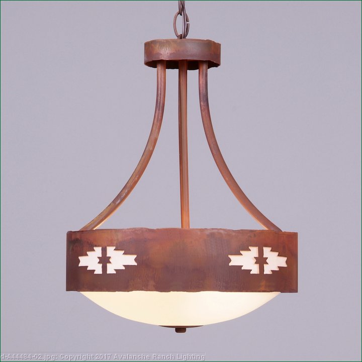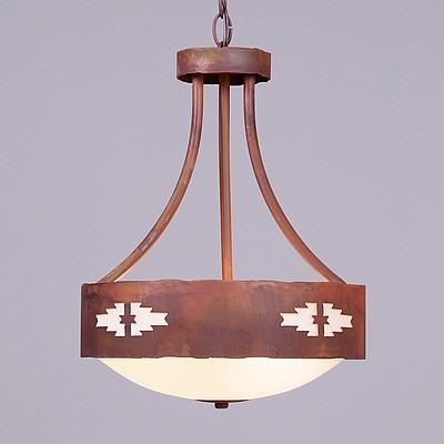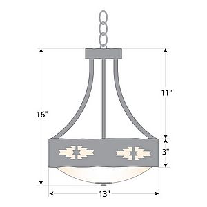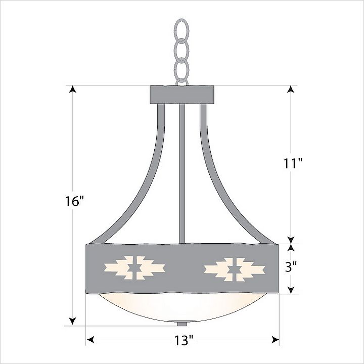 The Ridgemont Foyer Chandelier Medium - Pueblo is 13 inch in diameter and features our exclusive southwest pueblo art cutouts around the circumference of the fixture. Behind each cutout is a diffuser panel. Offered with the curved arms and frost white glass bowl only. A matching ceiling canopy, 3 feet of chain and 10 extra feet of wire are also included. The rustic design of this light, along with the warm atmosphere created by its lighting, will add stylish southwestern character to any home.
