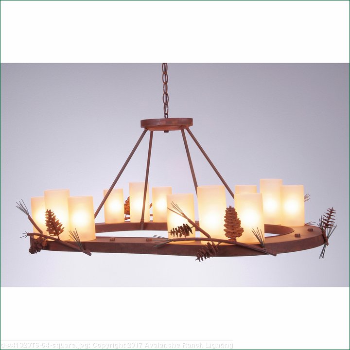 The Wisley Oval Chandelier - Pine Cone features a one- inch thick round band holding 12 candelabra bulbs with eight, 5 inch tall cylinder glass and four, 6 inch tall pieces for covering them. Choice of glass between frost clear or tea stain. Optionally for underneath, there are four type G4 20W halogen bulbs on a separate switch for lighting the area under the light. Handmade steel pine cones, pine needles and a steel branch are attached along the band in front of each of the bulb sets. This chandelier is ideal for anyone looking to add stylish rustic contemporary ceiling lighting to their log home, cabin or northwood lodge-themed room. A matching ceiling canopy, 3 ft of chain and 10 extra feet of wire are also included.