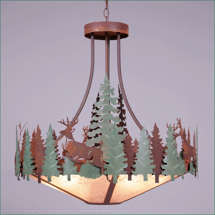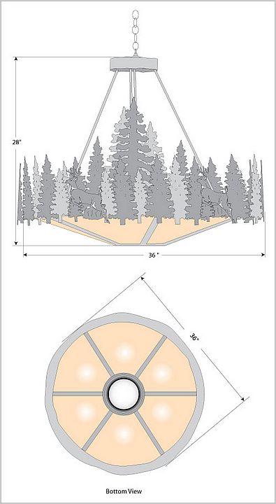 The Crestline Chandelier Large - Deer fixture is 36 inches in diameter and features images of deer and hand-painted trees over our rust patina finish. This chandelier will add a touch of wildlife and rustic character to any log home, cabin or northwood lodge-themed room. The fixture comes with a choice of diffuser material: Almond Mica, Amber Mica, or Ivory Paper. A downlight and matching ceiling canopy are also included, along with 3 feet of chain and 10 feet of extra wire.