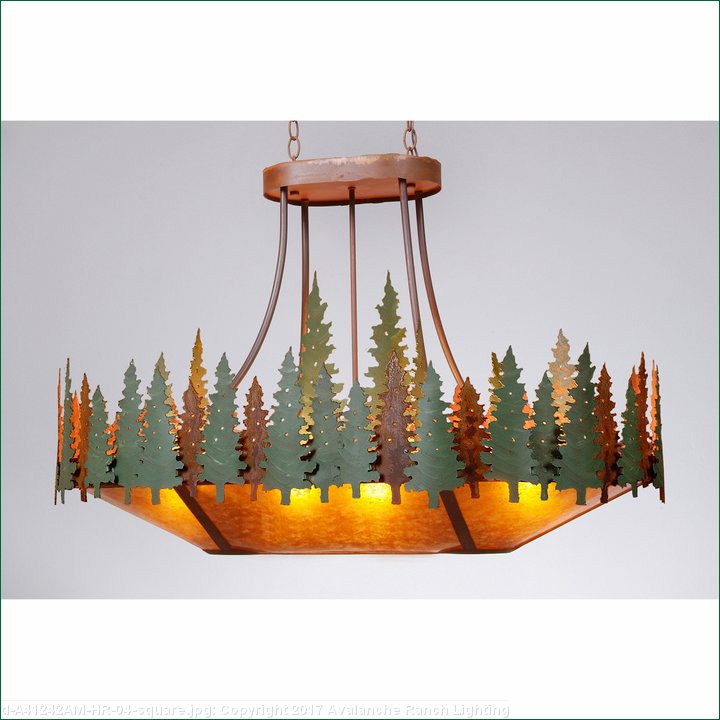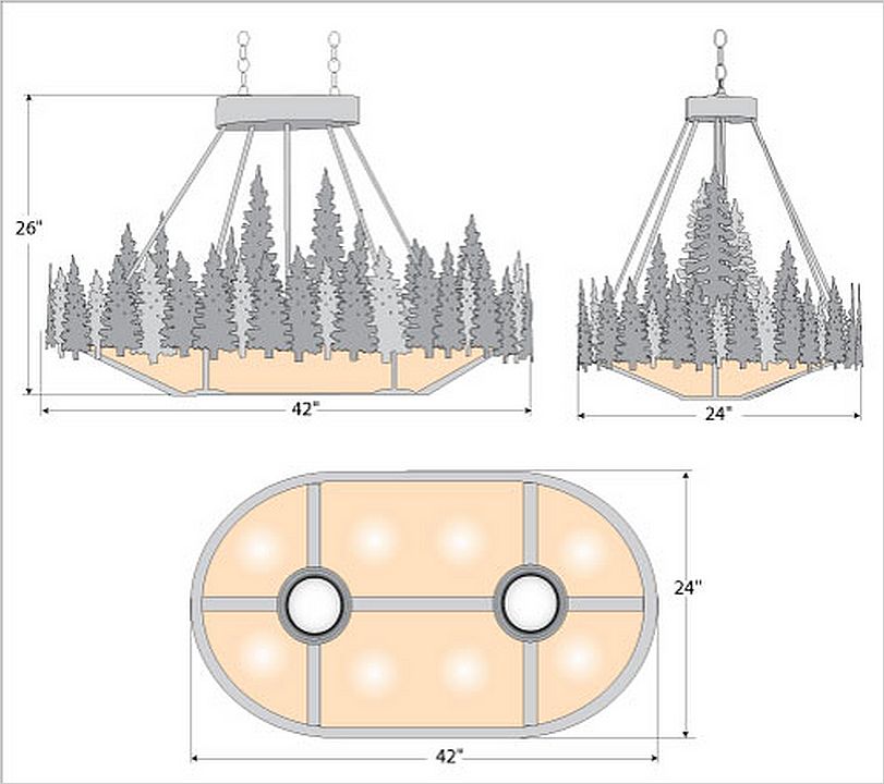 The Crestline Chandelier Oval - Pine fixture is an oval-shaped 24 by 42 inch chandelier, featuring various sizes of hand-painted trees over a rust patina-finished band. This chandelier will add warm lighting and rustic character to any log home, cabin or northwood lodge-themed room. It comes with a choice of diffuser material: Almond Mica, Amber Mica, or Ivory Paper. The fixture also features our Curved Side Pipes (HR), and has two downlights for direct lighting below. Included with the fixture is a matching ceiling canopy, 6 feet of chain (for a 3 foot drop), and 10 feet of wire.