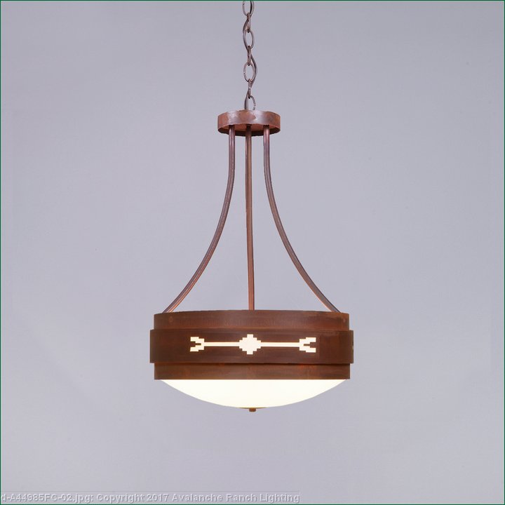 The Northridge Foyer Large - Del Rio fixture features three steel bands arranged on top of one another, the center band with cutouts of Southwest-inspired images going around the circumference of the fixture. Behind each cutout is synthetic mica and a frost white glass bowl is attached in the center. This light is ideal for anyone looking for a small, rustic chandelier to add Southwestern character to their log home, cabin or northwood lodge-themed room. May also be ordered in a compact fluorescent version for an additional charge. A matching ceiling canopy, 3 feet of chain and 10 extra feet of wire are also included.
