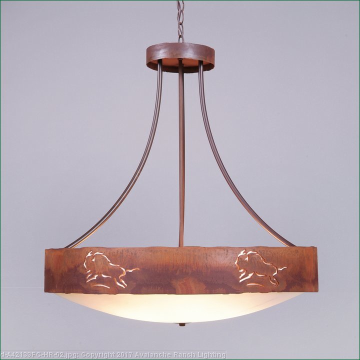 The Ridgemont Chandelier Medium - Bison is 27 inches in diameter and features our exclusive southwestern bison cutout around the steel band. Behind each cutout is a diffuser panel. This rustic chandelier comes with the choice of either a frosted glass bowl (FC) or a tea-stained glass bowl (TS). A matching ceiling canopy is also included, along with 3 feet of chain and 10 extra feet of wire. This item will add a rustic, Southwestern character to any log home, cabin or northwood lodge-themed room.