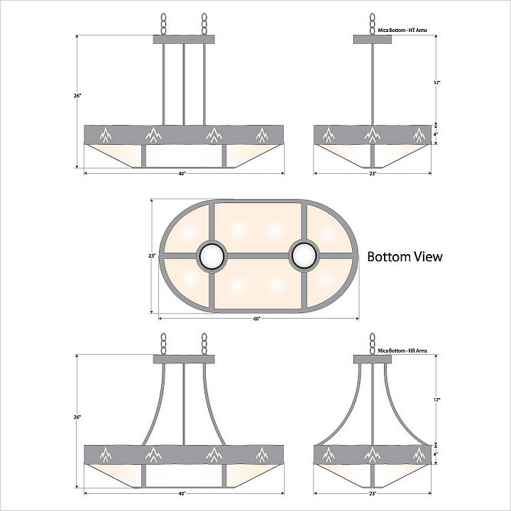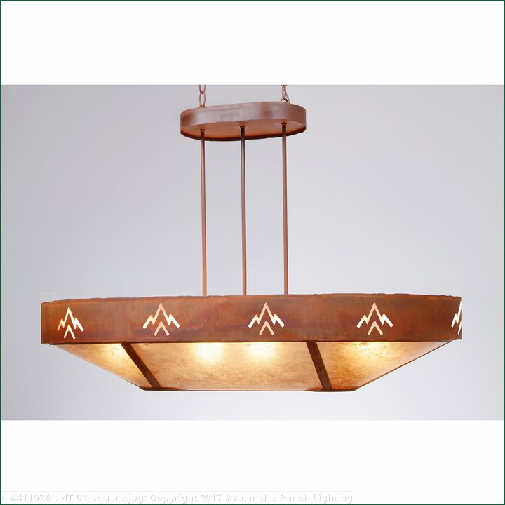 The Ridgemont Chandelier Oval - Deception Pass fixture is oval shaped 24 by 42 inches and features hand-cut mountain patterns around the band of the chandelier. This Southwest-inspired design is ideal for anyone looking for a rustic chandelier to add Southwestern character to their log home, cabin or northwood lodge-themed room. It comes with a choice of diffuser material: Almond Mica, Amber Mica, or Ivory Paper. There are also two downlights for direct lighting to a table. A matching ceiling canopy, along with 6 feet of chain (for a 3 foot drop) and 10 extra feet of wire are also included.