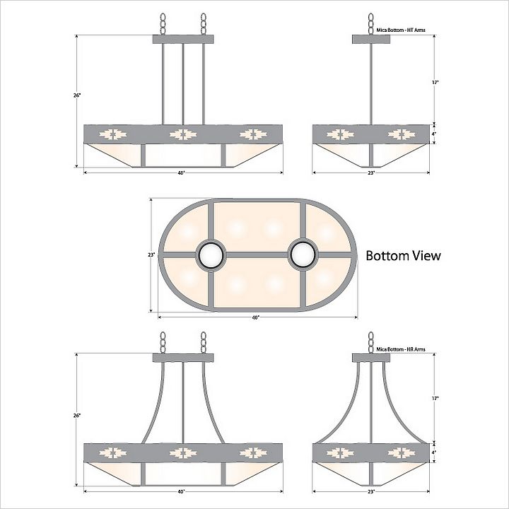 The Ridgemont Chandelier Oval - Pueblo fixture is oval shaped 24 by 42 inches and features Southwest-inspired hand-cut patterns around the band of the chandelier. This item is ideal for anyone looking for a rustic chandelier to add Southwestern character to their log home, cabin or northwood lodge-themed room. It comes with a choice of diffuser material: Almond Mica, Amber Mica, or Ivory Paper. There are also two downlights for direct lighting to a table. A matching ceiling canopy, along with 6 feet of chain (for a 3 foot drop) and 10 extra feet of wire are also included.
