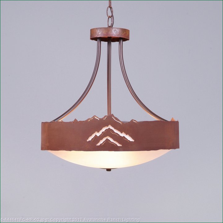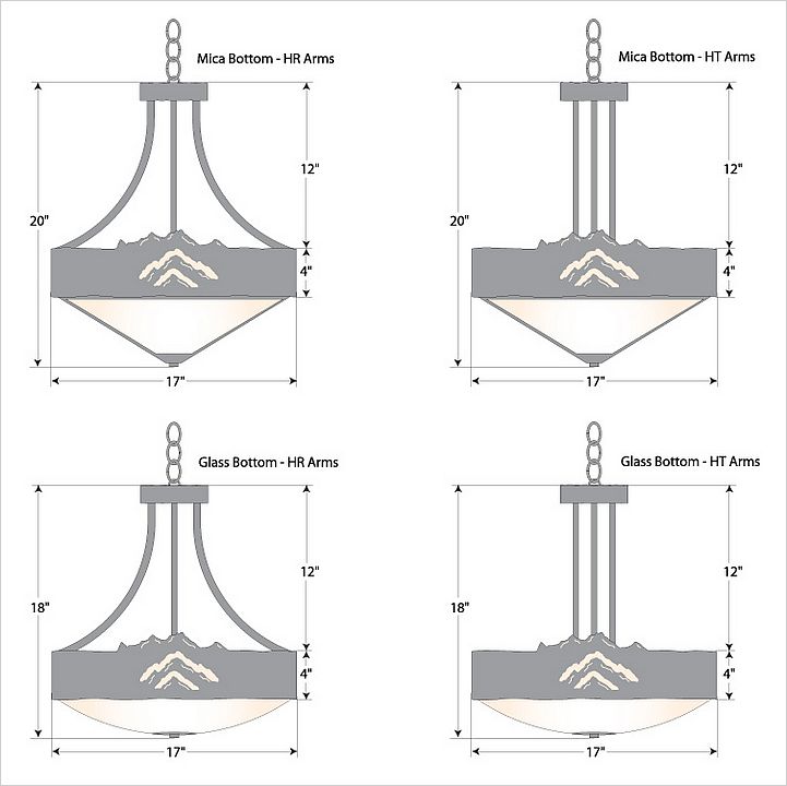 The Ridgemont Foyer Chandelier Large Short - Glass Bottom- Mountain Cutout is 17 inches in diameter by 17 inches tall, and features our exclusive mountain cutouts around the steel band. Behind each cutout is a diffuser panel. This small chandelier comes with the choice of either a frosted glass bowl (FC) or a tea-stained glass bowl (TS). A matching ceiling canopy is also included, along with 3 feet of chain and 10 extra feet of wire. This forest-inspired design will add a rustic, woodland character to the entryway of any log home, cabin or northwood lodge-themed room.