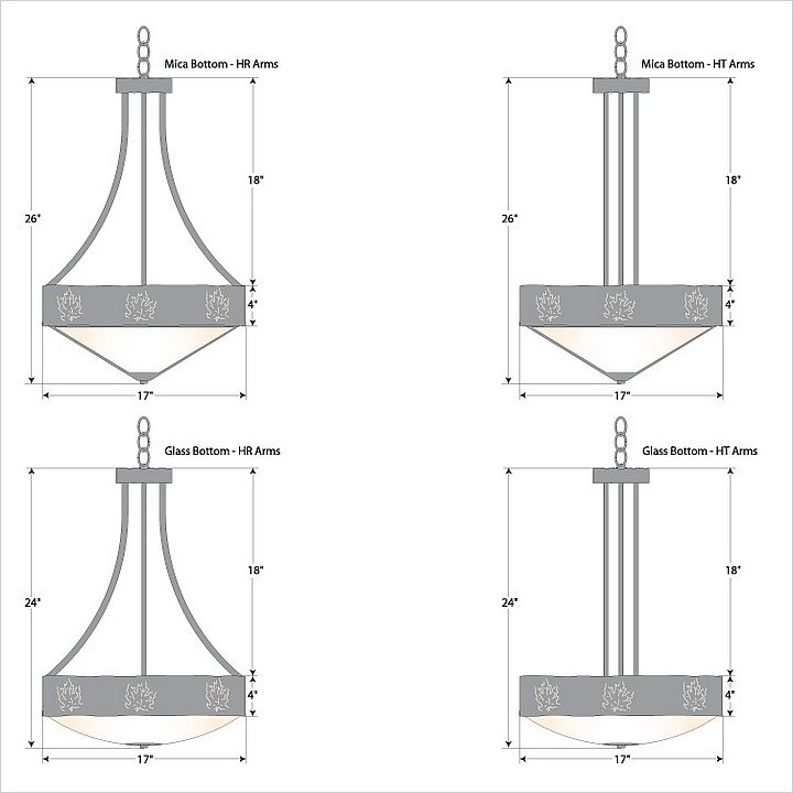 The Ridgemont Foyer Chandelier Large Tall - Shade Bottom- Maple Cutout is 17 inches in diameter by 25 inches tall, and features our exclusive maple leaf cutouts around the steel band. Behind each cutout is a diffuser panel. This small chandelier comes with a choice of diffuser material: Almond Mica, Amber Mica, or Ivory Paper. A matching ceiling canopy is also included, along with 3 feet of chain and 10 extra feet of wire. This forest-inspired design will add a rustic, woodland character to the entryway of any log home, cabin or northwood lodge-themed room.