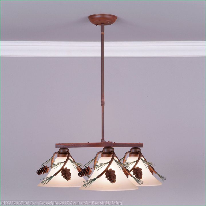 The Cedarwood 3 Light Chandelier - Pine Cone features three bulbs, adjustable height stem and a choice of two different styles of cone glass. Surrounding each piece of glass is our exclusive three dimensional pine cone artwork. Included with the fixture is 10 feet of wire and a telescoping stem that has a 12 inch adjustment range from 15 to 27 inches. For longer adjustments up to 138 inches, order one or more of the extension kits. A matching 5 by 6 inch ceiling canopy is also included. To add extensions to stem length, use accessory kits for single stem fixtures PK210.