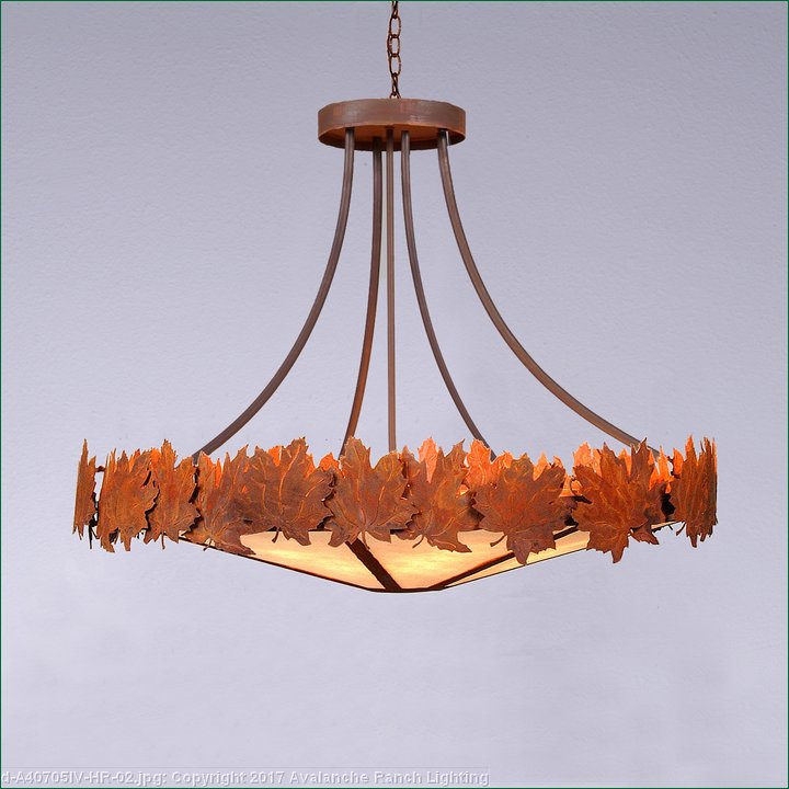 The Crestline Chandelier Extra Large - Maple fixture is 48 inches in diameter and features a band of metal maple leaves. The leaves are positioned in various directions along the band, and also feature hand-cut interior lines inside each image. This rustic chandelier comes with a choice of diffuser material: Almond Mica, Amber Mica, or Ivory Paper. A downlight and matching ceiling canopy are also included, along with 3 feet of chain and 10 feet of extra wire. This chandelier will add rustic character to any log home, cabin or northwood lodge-themed room.