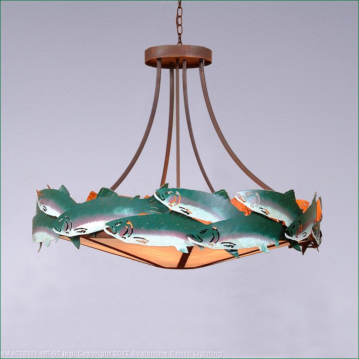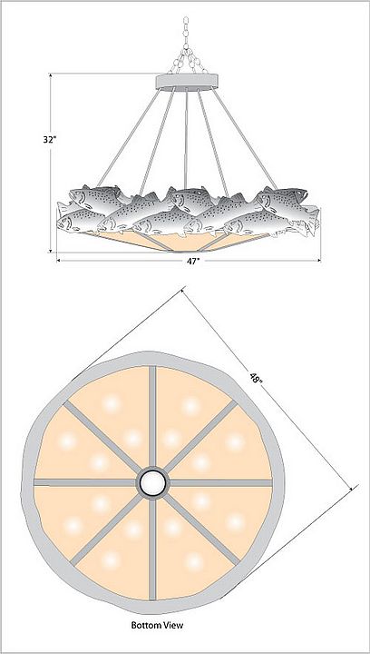 The Crestline Chandelier Extra Large - Trout fixture is 48 inches in diameter and features our trademarked trout images along the band of the fixture, which are hand-painted using our unique seven-step finishing process. This chandelier will add warm lighting and rustic character to any fisherman's home, log home, cabin, or northwood lodge-themed room. It comes with a choice of diffuser material: Almond Mica, Amber Mica, or Ivory Paper. A downlight and matching ceiling canopy are also included, along with 3 feet of chain and 10 feet of extra wire.