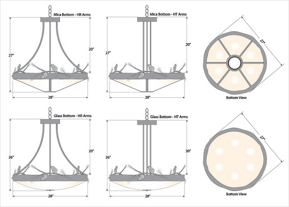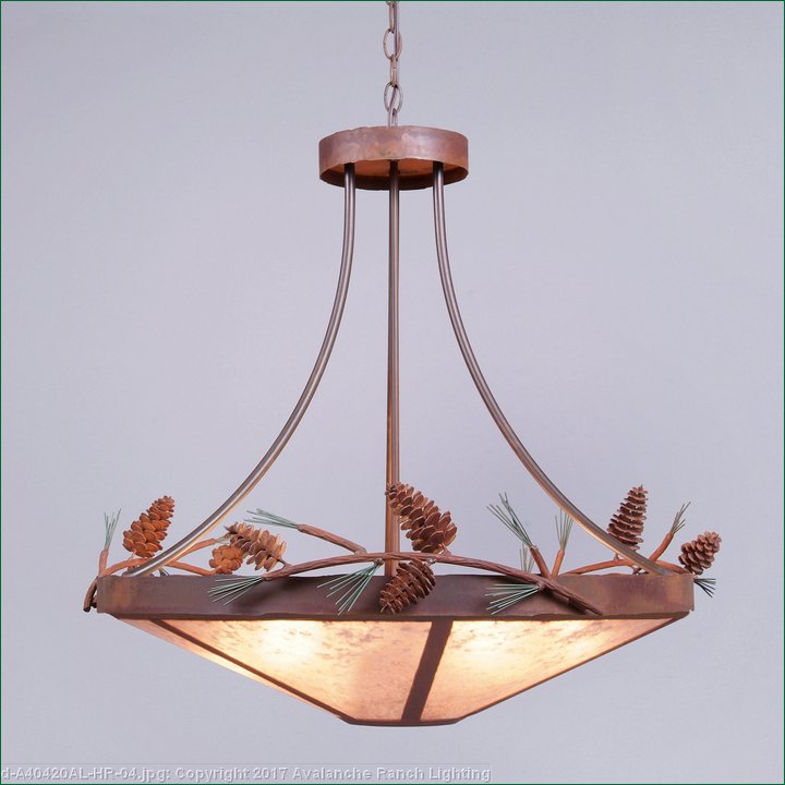 The Crestline Chandelier Small - Pine Cone fixture is 28 inches in diameter and features three sets of pine cone branches positioned around a metal band. Each metal pine cone is handmade, and the branch is textured to look life-like with metal wire pine needles. This rustic chandelier comes with a choice of diffuser material: Almond Mica, Amber Mica, or Ivory Paper. The fixture features our standard Curved Side Pipes (HR), but for an extra charge, we also make the Pine Branch Arms with pines cones and needles (HP). A downlight and matching ceiling canopy are also included, along with 3 feet of chain and 10 feet of extra wire. This chandelier will add rustic character to any log home, cabin or northwood lodge-themed room.