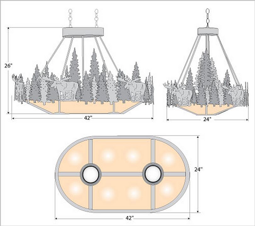 The Crestline Chandelier Oval - Moose fixture is an oval-shaped 24 by 42 inch chandelier. This item features images of moose and hand-painted trees over a rust patina-finished band. This chandelier will add a touch of wildlife and rustic character to any log home, cabin or northwood lodge-themed room. It comes with a choice of diffuser material: Almond Mica, Amber Mica, or Ivory Paper. The fixture also features our Curved Side Pipes (HR), and has two downlights for direct lighting below. Included with the fixture is a matching ceiling canopy, 6 feet of chain (for a 3 foot drop), and 10 feet of wire.