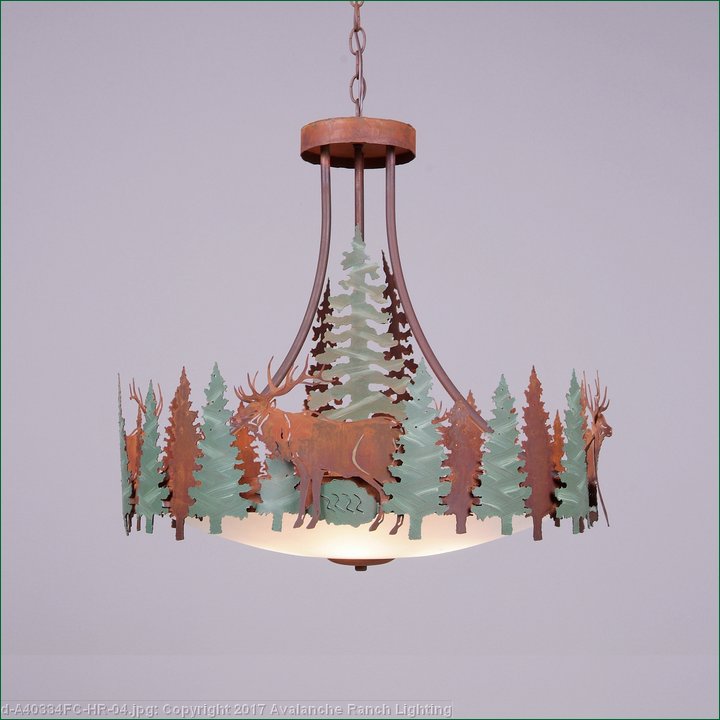 The Crestline Chandelier Small - Elk fixture is 24 inches in diameter and features images of elk and hand-painted trees over our rust patina finish. This chandelier will add a touch of wildlife and rustic character to any log home, cabin or northwood lodge-themed room. This rustic chandelier comes with the choice of either a frosted glass bowl (FC) or a tea-stained glass bowl (TS). A downlight and matching ceiling canopy are also included, along with 3 feet of chain and 10 feet of extra wire.