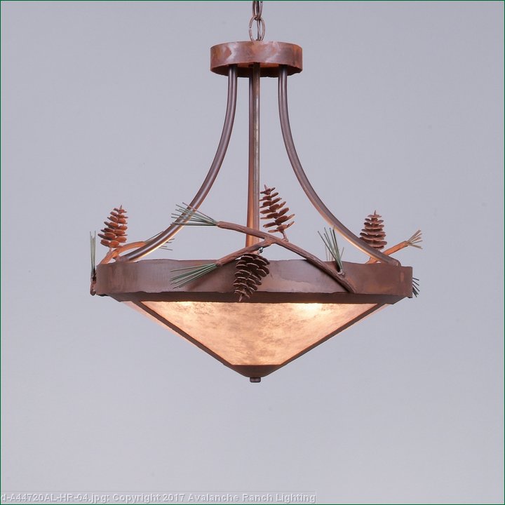 The Crestline Foyer Chandelier Short - Pine Cone is 18 inches in diameter by 18 inches tall, and features three sets of pine cone branches positioned around a metal band. Each metal pine cone is handmade, and the branch is textured to look life-like with metal wire pine needles. This rustic chandelier comes with a choice of diffuser material: Almond Mica, Amber Mica, or Ivory Paper. The fixture features our standard Curved Side Pipes (HR), but for an extra charge, we also make the Pine Branch Arms with pines cones and needles (HP). A matching ceiling canopy is also included, along with 3 feet of chain and 10 extra feet of wire. This forest-inspired chandelier will add a rustic, northwoods character to the entryway of any log home, cabin or northwood lodge-themed room.