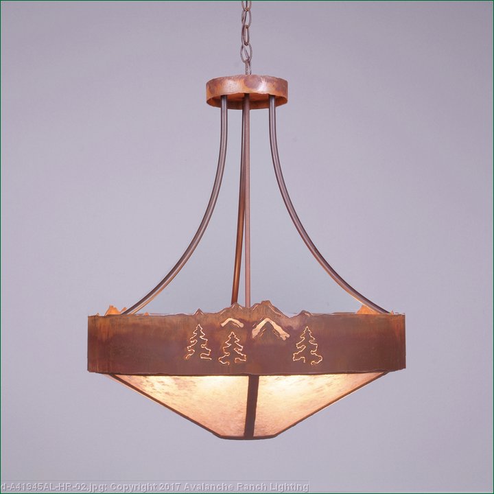 The Ridgemont Chandelier Small - Mountain/Pine is 24 inches in diameter and features our exclusive mountain-pine cutout around the steel band. Behind each cutout is a diffuser panel. This rustic chandelier comes with a choice of diffuser material: Almond Mica, Amber Mica or Ivory Paper. For the styles with a diffuser bottom, a single downlight is built into the bowl. A matching ceiling canopy is also included, along with 3 feet of chain and 10 extra feet of wire. This forest-inspired design will add a rustic, woodland character to any log home, cabin or northwood lodge-themed room.