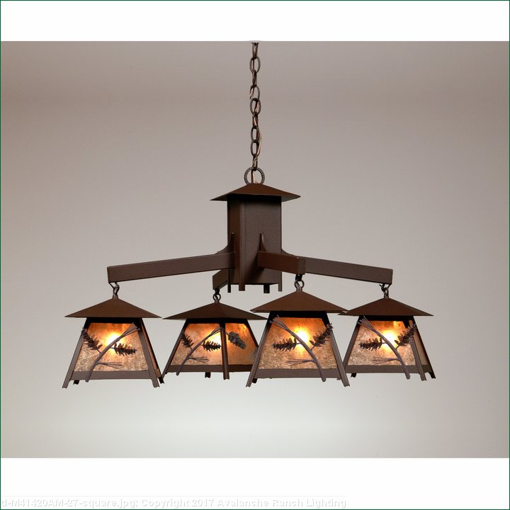 The Smoky Mtn 4 Light Chandelier - Pine cone features our Smoky Mtn small lanterns hanging at a slight downward angle from four steel arms. Our exclusive steel pine cone branches are displayed on the two front panels of each lantern, along with 3D pine cone artwork on the side panels. The lanterns also come with a diffuser material choice between Almond or Amber mica. A square ceiling canopy is included, along with 3 feet of chain and 10 extra feet of wire. This rustic chandelier will bring character to any log home, cabin or northwood lodge-themed room.