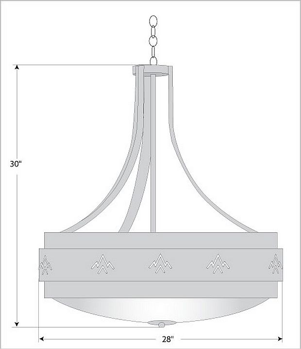 The Northridge Chandelier Large - Deception Pass fixture features three steel bands arranged on top of one another, the center band with cutouts of mountain images going around the circumference of the fixture. Behind each cutout is thin acrylic panels and a frost white glass bowl is attached in the center. This Southwest-inspired design is ideal for anyone looking for a rustic chandelier to add Southwestern character to their log home, cabin or northwood lodge-themed room. A matching ceiling canopy, 3 feet of chain and 10 extra feet of wire are also included.